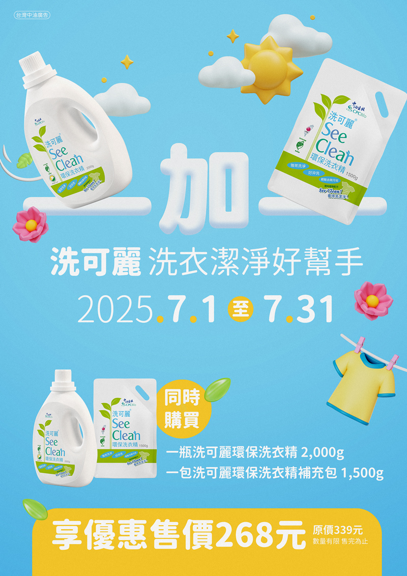 購買洗衣潔淨好幫手1+1(洗衣精2000g+補充包1500g),優惠268元(原價339元)。